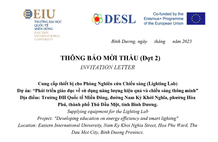 THÔNG BÁO MỜI THẦU BỔ SUNG (Đợt 2) EXTENDED INVITATION LETTER Cung cấp thiết bị cho Phòng nghiên cứu chiếu sáng (Lighting Lab) Dự án: “Phát triển giáo dục về sử dụng năng lượng hiệu quả và chiếu sáng thông minh” Địa điểm: Trường ĐH Quốc tế Miền Đông, đường Nam Kỳ Khởi Nghĩa, phường […]