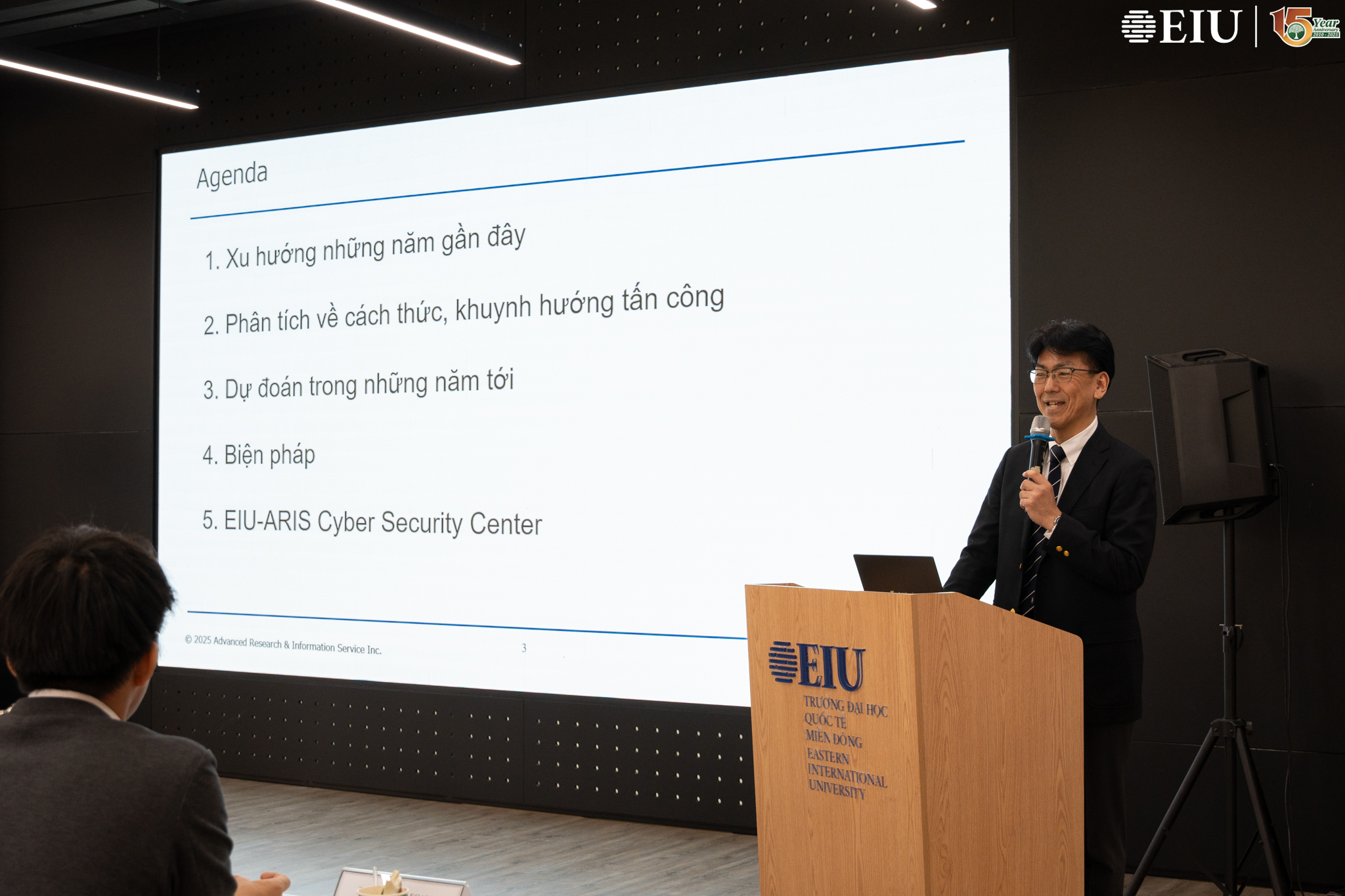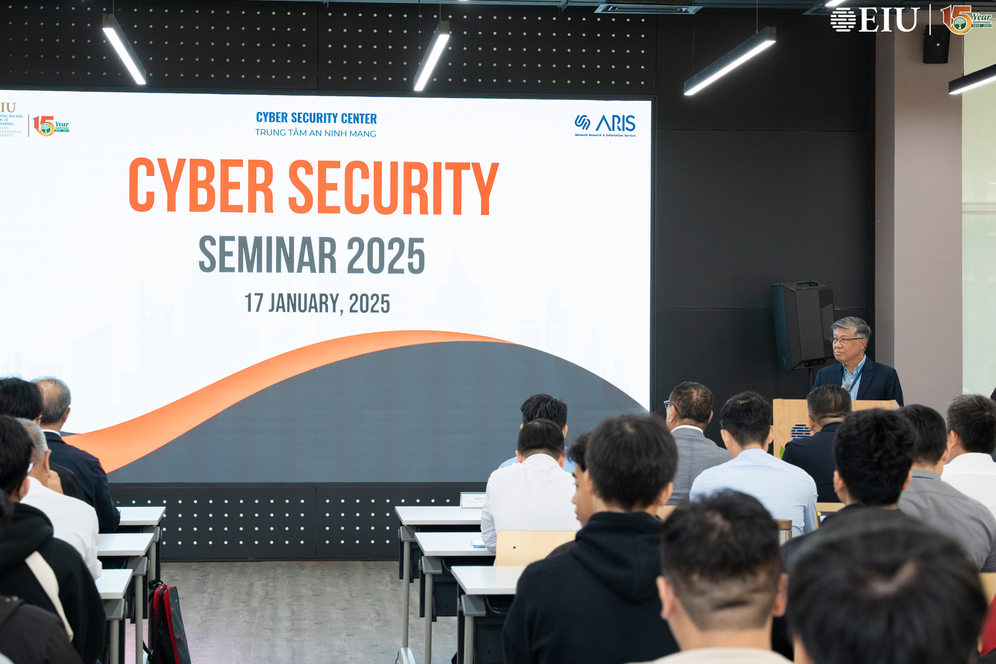 As part of the program, in the afternoon session, ARIS experts collaborated with the School of Information Technology to conduct a cybersecurity training workshop for EIU students at the EIU–ARIS Cybersecurity Center. This session provided not only opportunities for in-depth knowledge sharing but also valuable practical experience. Students had the chance to directly learn from top cybersecurity experts at ARIS, thereby improving their awareness and skills in dealing with current and future cybersecurity threats./.