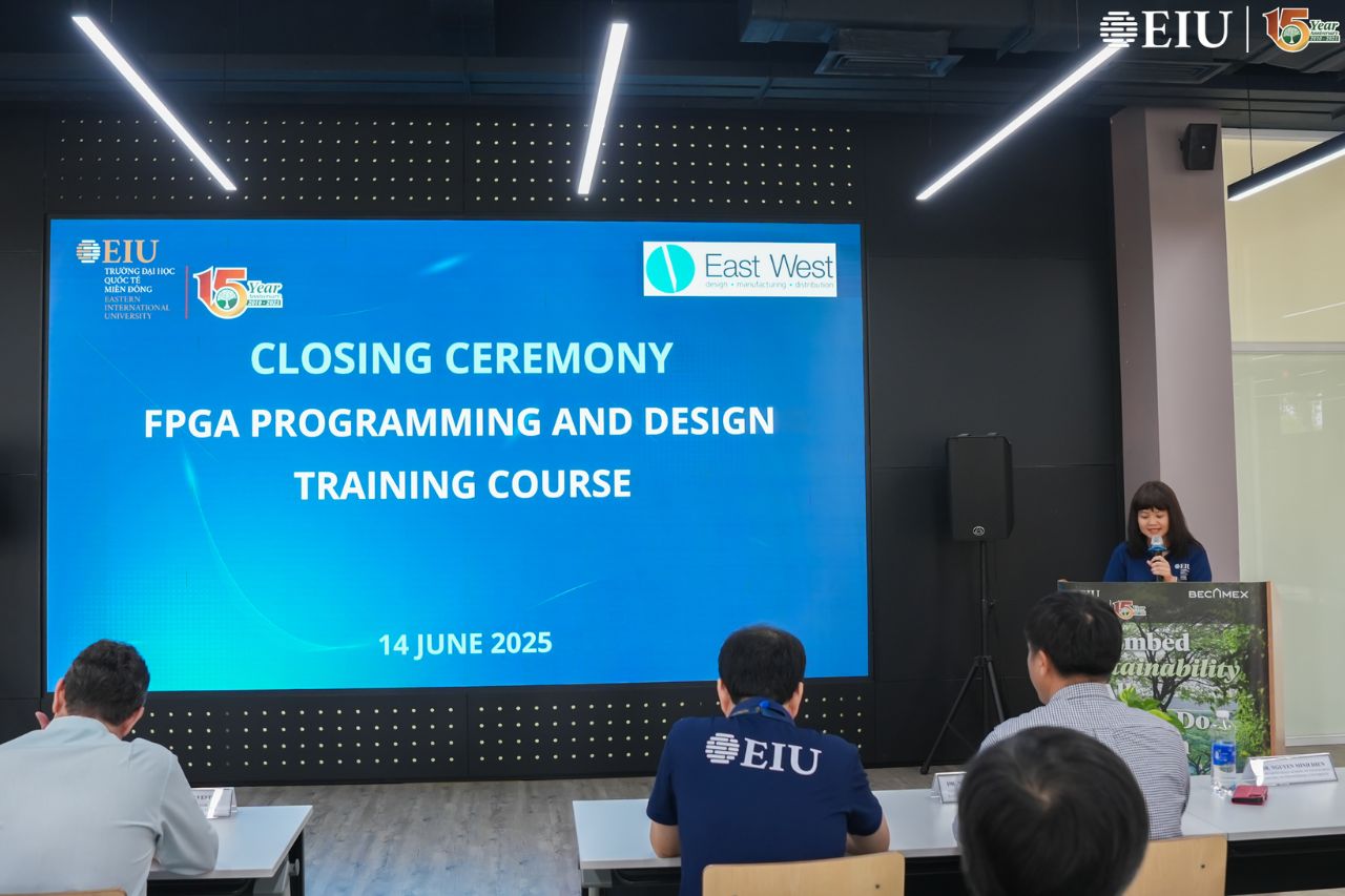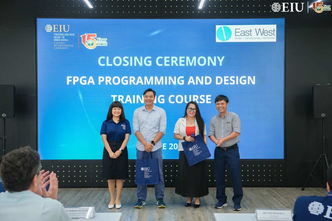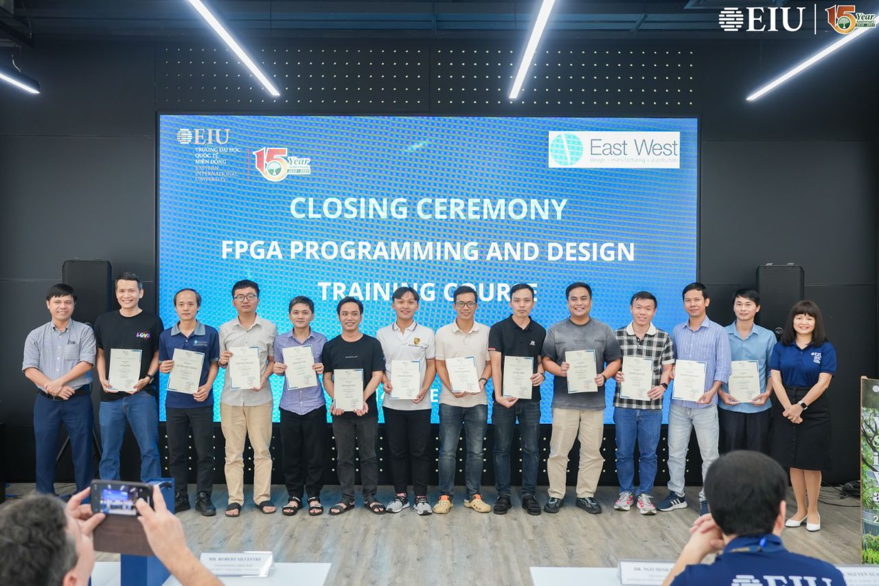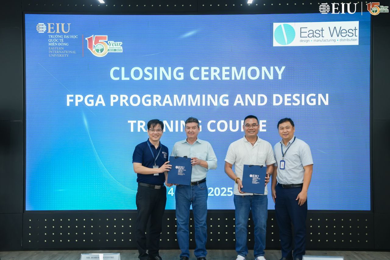 On June 14, Eastern International University (EIU) held the Graduation Ceremony and Certificate Presentation for participants of the “FPGA Programming and Design” course. The trainees were engineers from East West Industries Vietnam (EWI). EWI is a member of the East West Manufacturing Group (USA), established in VSIP II in 2008, and is a large-scale manufacturer of electronic components, offering services ranging from PCB assembly, plastic injection molding, and metal stamping to final product assembly and testing for the global market.