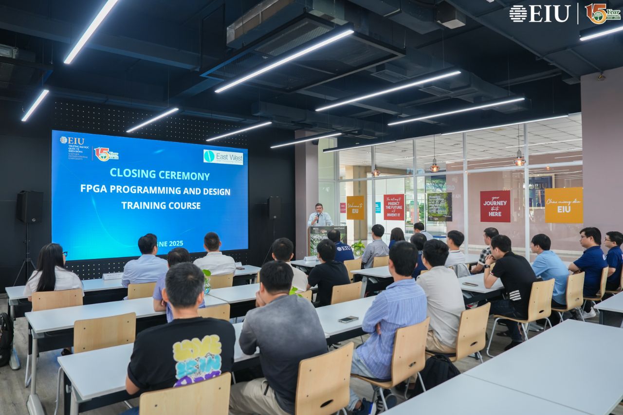 At the end of the event, EIU awarded Certificates of Completion to 12 engineers, marking a significant step in the practical application of FPGA knowledge in production and electronic product design. The “FPGA Programming and Design” course is a clear testament to the strong partnership between EIU and its industry partners in developing applied knowledge, strengthening the skillsets of engineering teams, and contributing meaningfully to technological innovation and modern industrial development in Southeast Vietnam and the country as a whole.