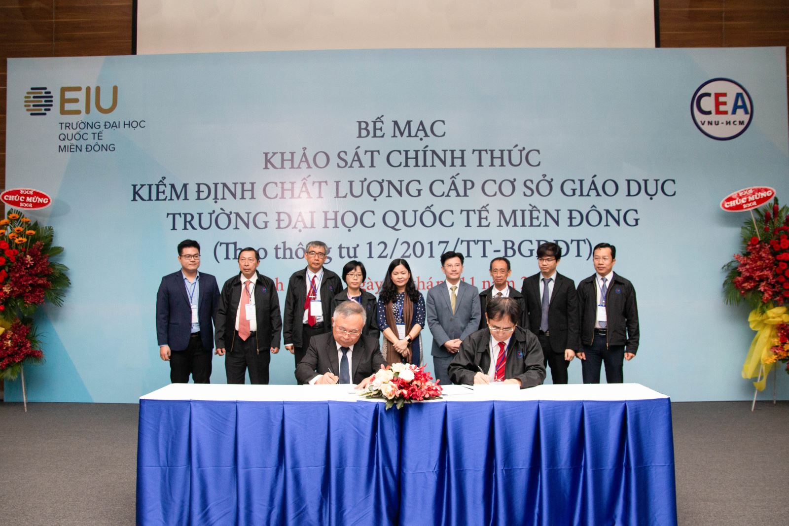 Trước khi kết thúc chương trình, PGS.TS Nguyễn Hội Nghĩa – Trưởng Đoàn Đánh giá ngoài và TS. Nguyễn Văn Phúc – Hiệu trưởng Nhà trường đã cùng ký kết biên bản ghi nhớ sau khảo sát chính thức giữa Trung tâm Kiểm định Chất lượng Giáo dục ĐHQG TP.HCM và EIU.