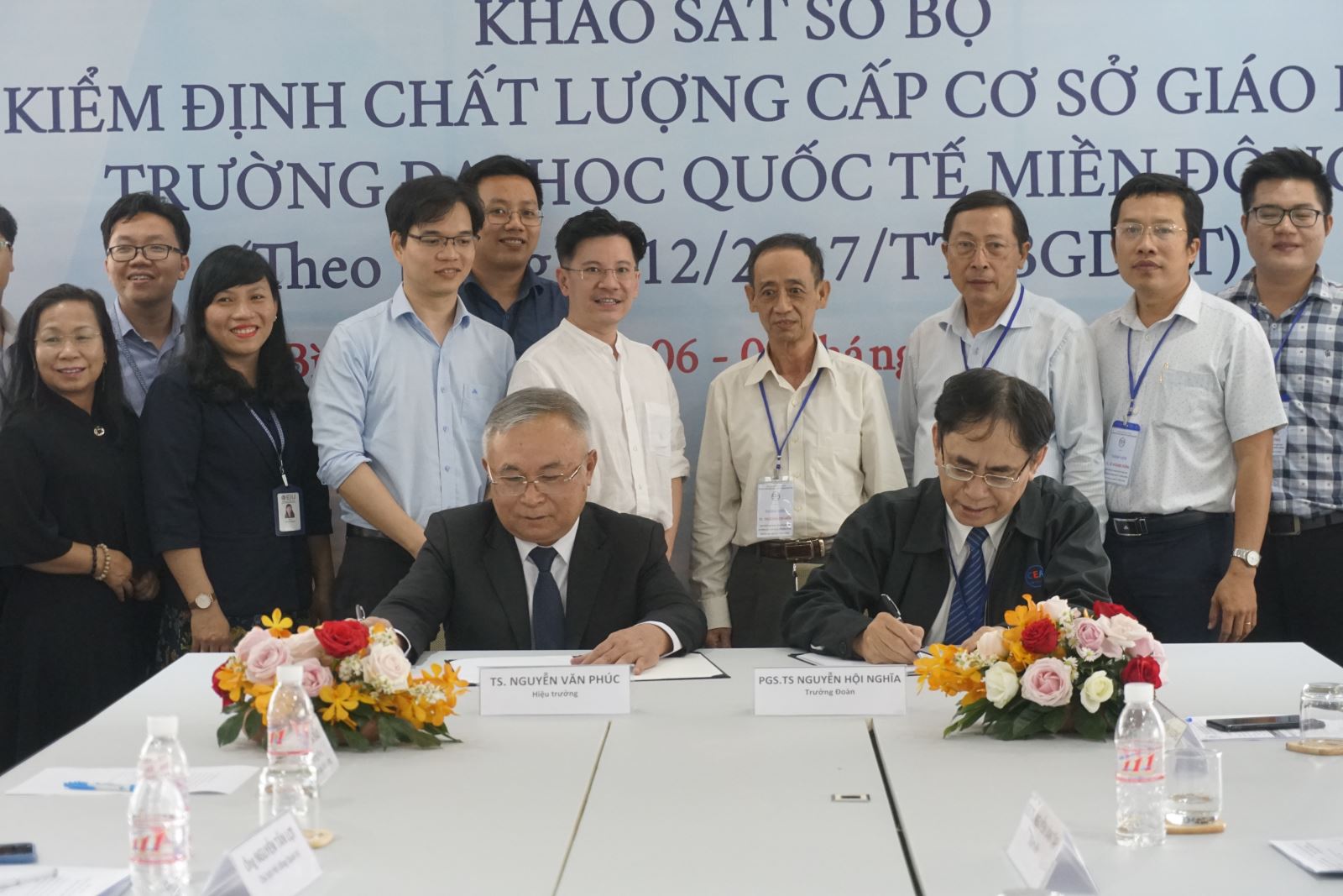 TS. Nguyễn Văn Phúc  – Hiệu trưởng EIU và PGS.TS. Nguyễn Hội Nghĩa – Trưởng Đoàn đánh giá đã cùng ký Biên bản ghi nhớ hoàn tất việc kiểm tra sơ bộ