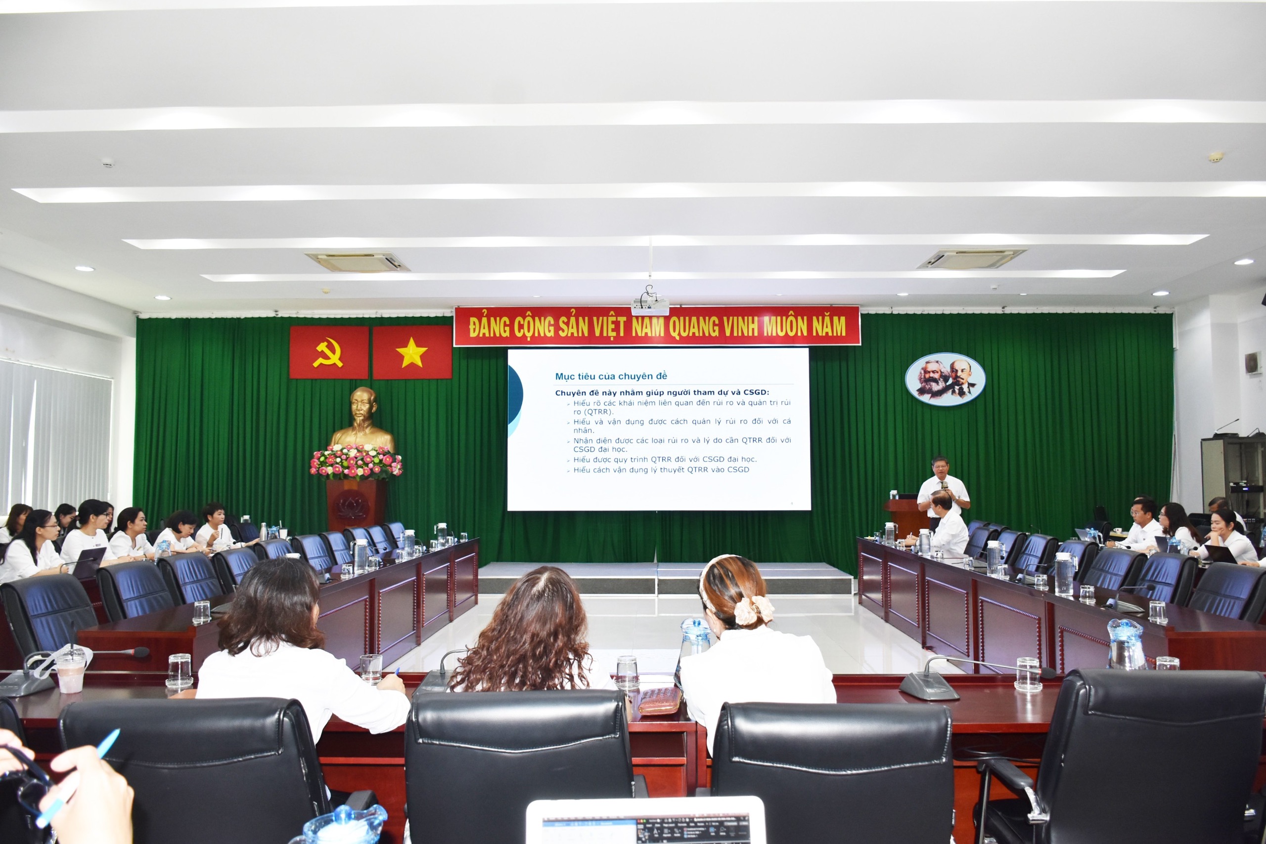 Nhằm góp phần thực hiện Thỏa thuận hợp tác giữa Trường Đại học Quốc tế Miền Đông (EIU) và Học viện Cán bộ TP. HCM (HCA) đã được hai bên ký kết vào tháng 12/2022, sáng ngày 19/6/2023 PGS.TS. Lê Văn Hảo – Trưởng bộ phận Học thuật xuất sắc của EIU đã đến HCA để tập huấn công tác Quản trị rủi ro (QTRR) cho đội ngũ cán bộ quản lý và giảng viên tại đây. Nội dung tập huấn nhằm giúp các đối tượng tham dự:
