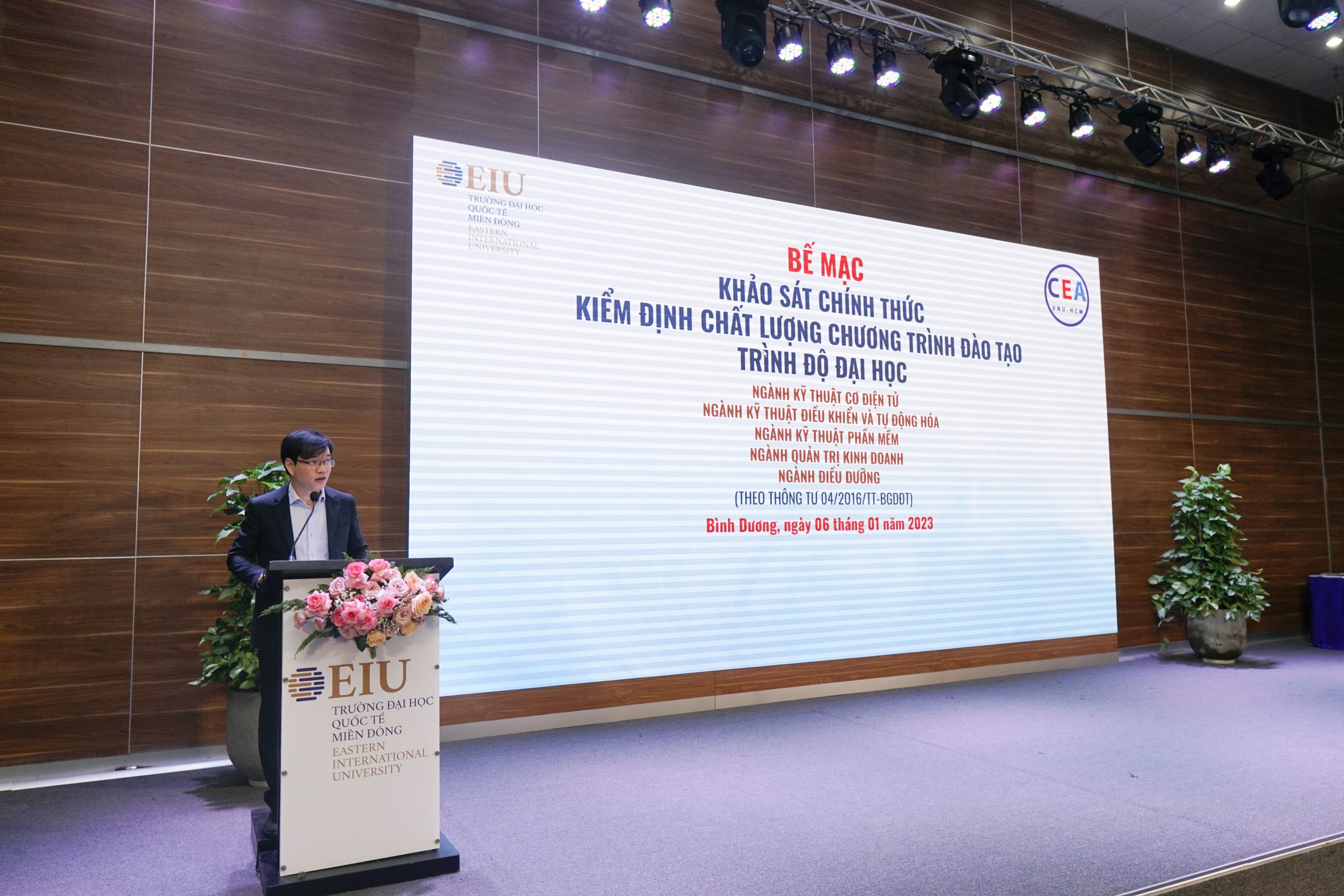 Tại chương trình, ThS. Hồ Đắc Hải Miên – Phó Giám đốc Trung tâm Kiểm định chất lượng giáo dục ĐHQG TP.HCM gửi lời cảm ơn Nhà trường đã tạo điều kiện tốt nhất để Đoàn ĐGN làm việc tích cực và hiệu quả. ThS. Hồ Đắc Hải Miên cũng đánh giá cao môi trường học tập cùng với Hệ sinh thái đổi mới sáng tạo tại EIU đồng thời hy vọng rằng những kiến nghị của Đoàn ĐGN sẽ giúp EIU có thêm cơ sở để tiếp tục phát huy hơn nữa những giá trị trong chiến lược phát triển của Trường.