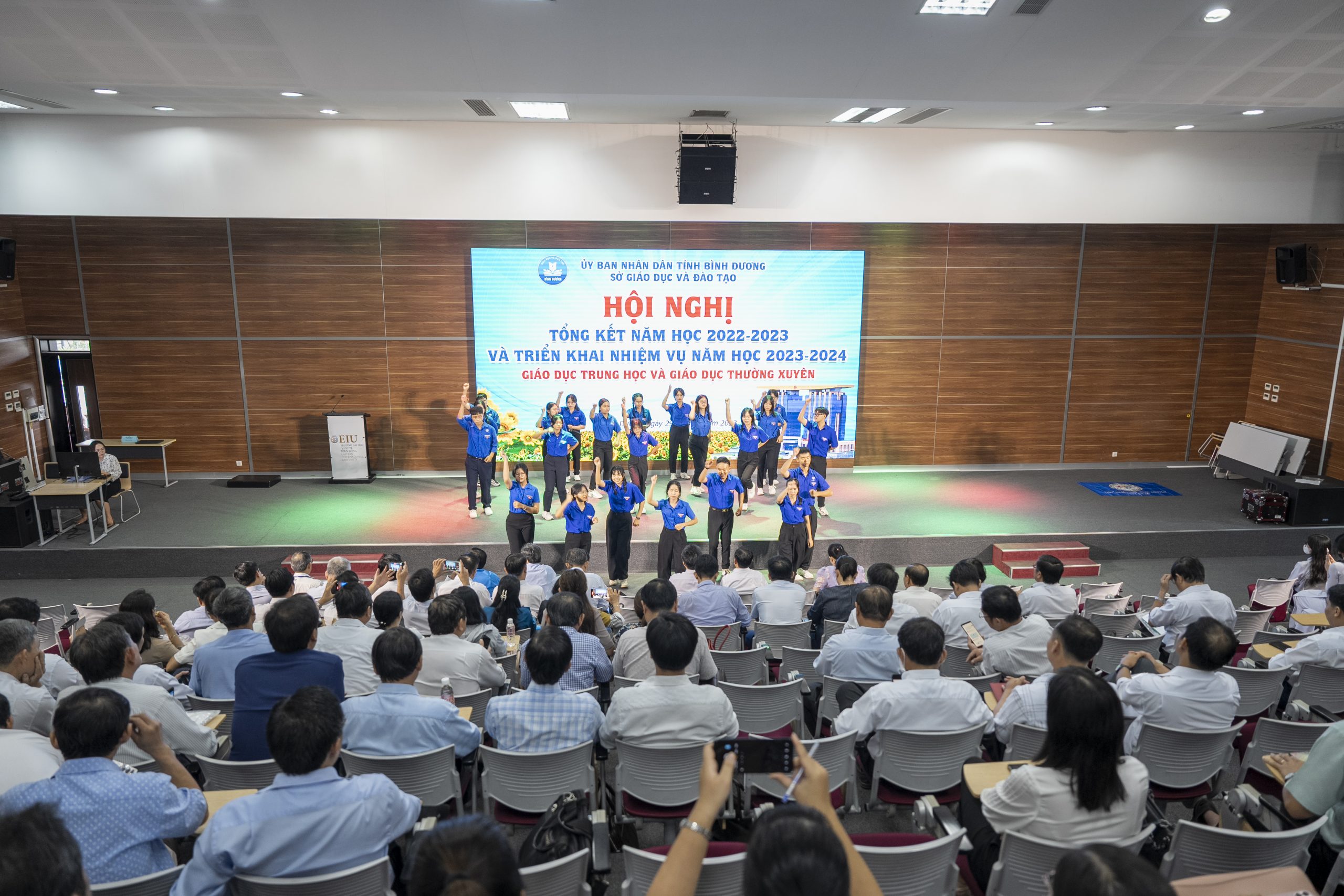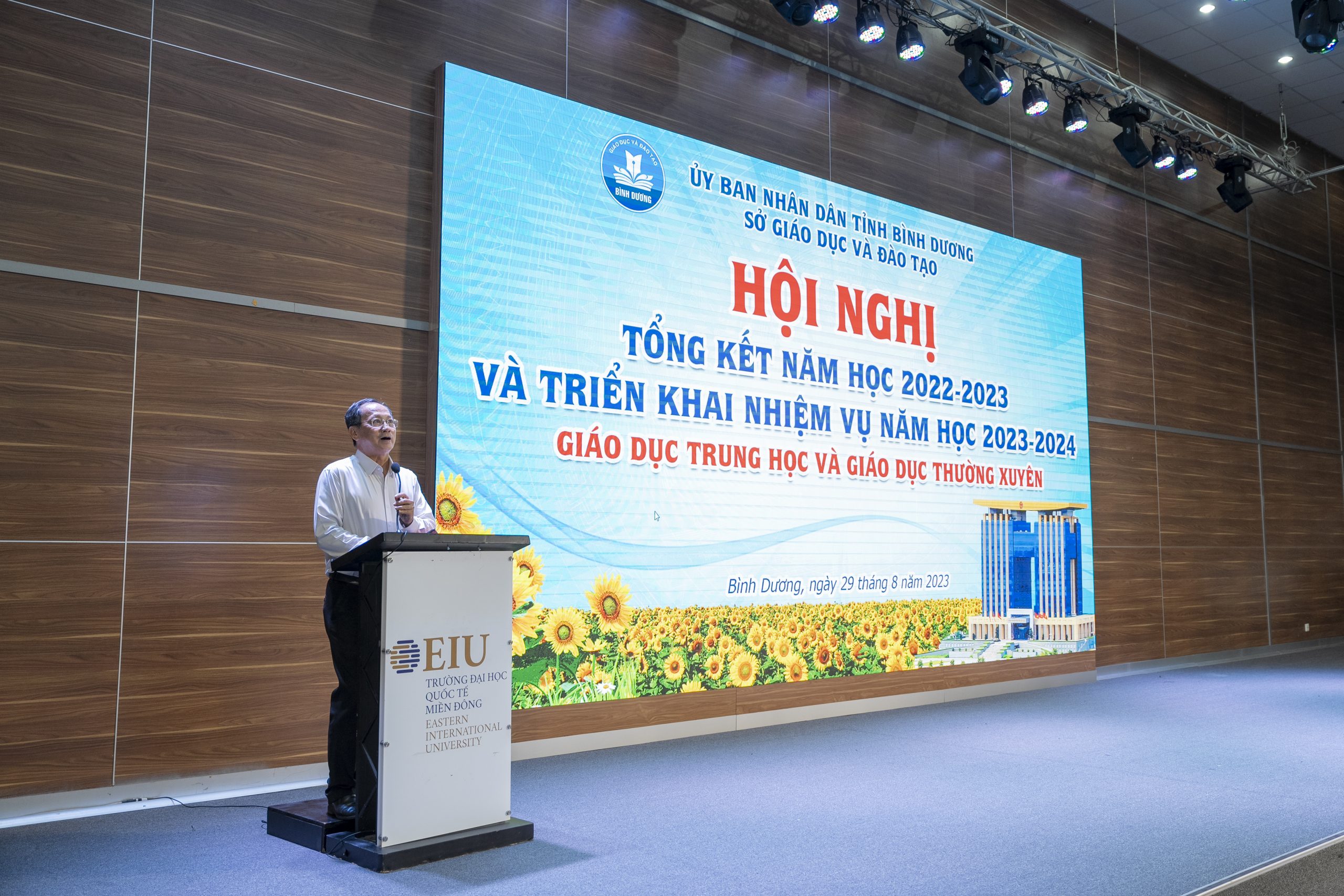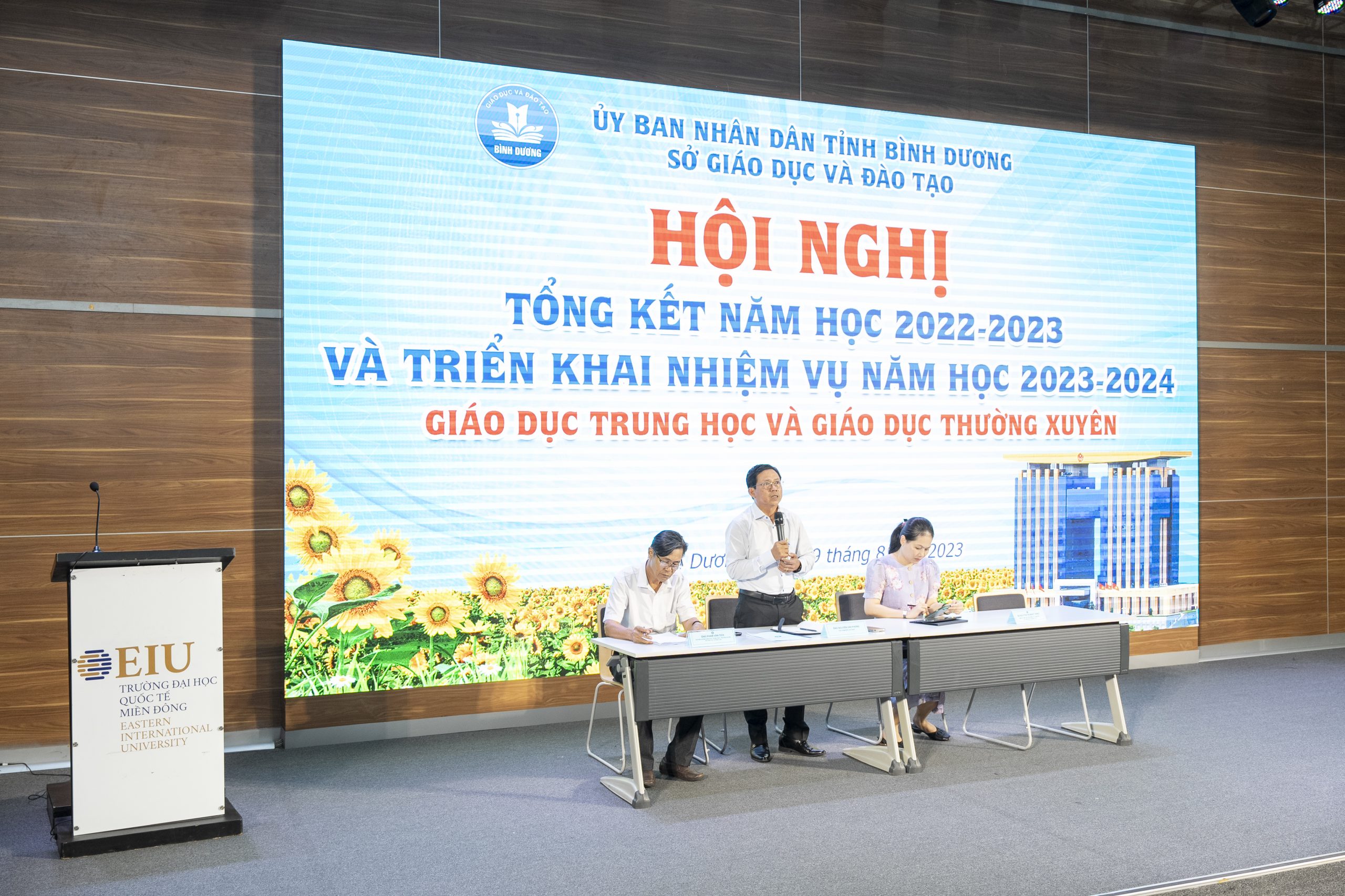 Sáng ngày 29/8/2023, tại EIU, Sở Giáo dục và Đào tạo Tỉnh Bình Dương đã tổ chức Hội nghị Tổng kết năm học 2022 – 2023 và Triển khai phương hướng nhiệm vụ năm học 2023 – 2024 đối với giáo dục trung học và giáo dục thường xuyên. Chương trình có sự tham dự của Bà Nguyễn Thị Nhật Hằng – Giám đốc Sở Giáo dục và Đào tạo tỉnh Bình Dương; Ông Nguyễn Văn Phong – Phó Giám đốc Sở Giáo dục và Đào tạo tỉnh Bình Dương cũng lãnh đạo các phòng ban của Sở; lãnh đạo các Phòng Giáo dục Trung học – Thường xuyên và đại diện phòng ban nghiệp vụ của các Phòng Giáo dục Trung học – Thường xuyên các huyện, thị xã, thành phố trực thuộc Tỉnh; BGH các trường THPT, trung tâm giáo dục thường xuyên. Về phía EIU, có sự tham dự của TS. Nguyễn Ngọc Huy – Phó Hiệu trưởng Nhà trường.