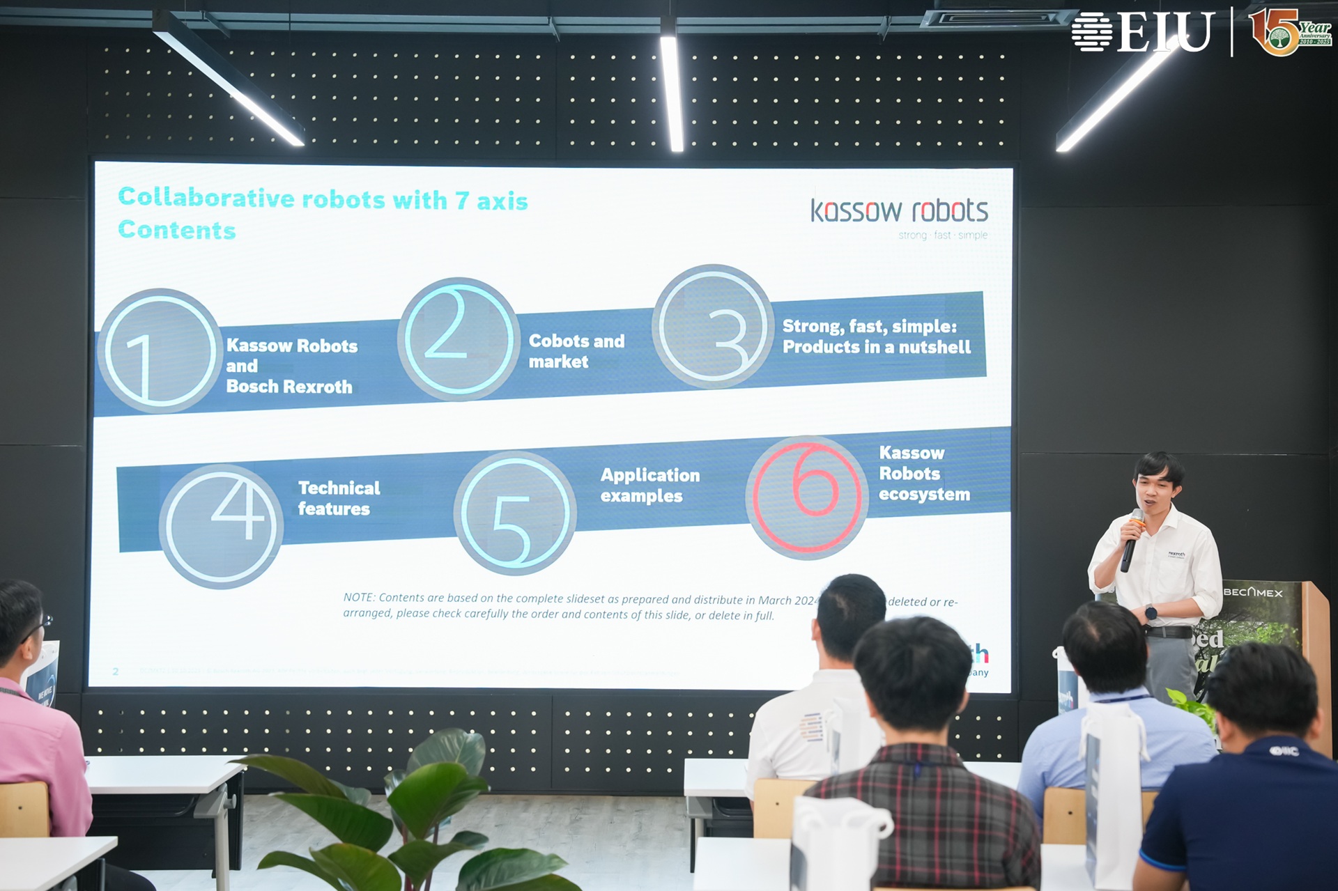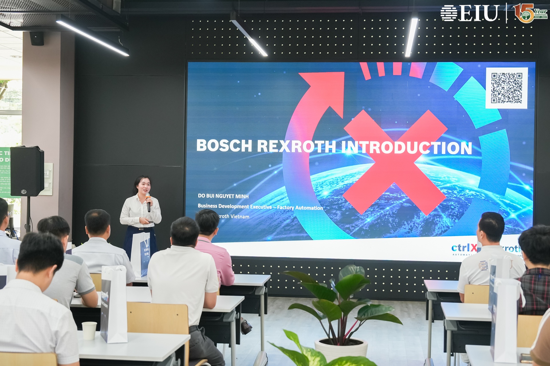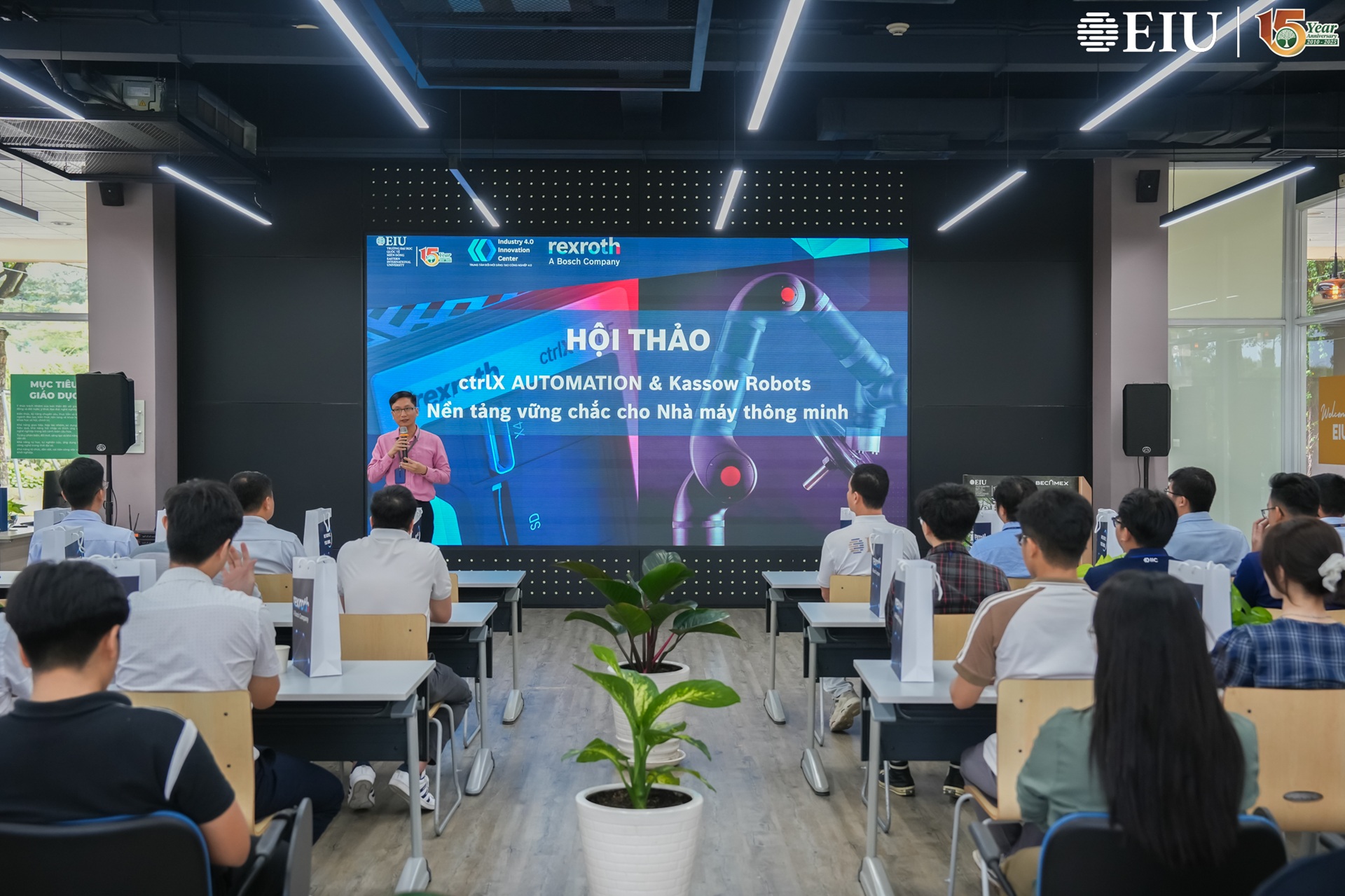 Sáng ngày 09/7, Trường Đại học Quốc tế Miền Đông (EIU) phối hợp cùng Bosch Rexroth tổ chức hội thảo với chủ đề “CtrlX Automation & Kassow Robots: Nền tảng vững chắc cho nhà máy thông minh”.