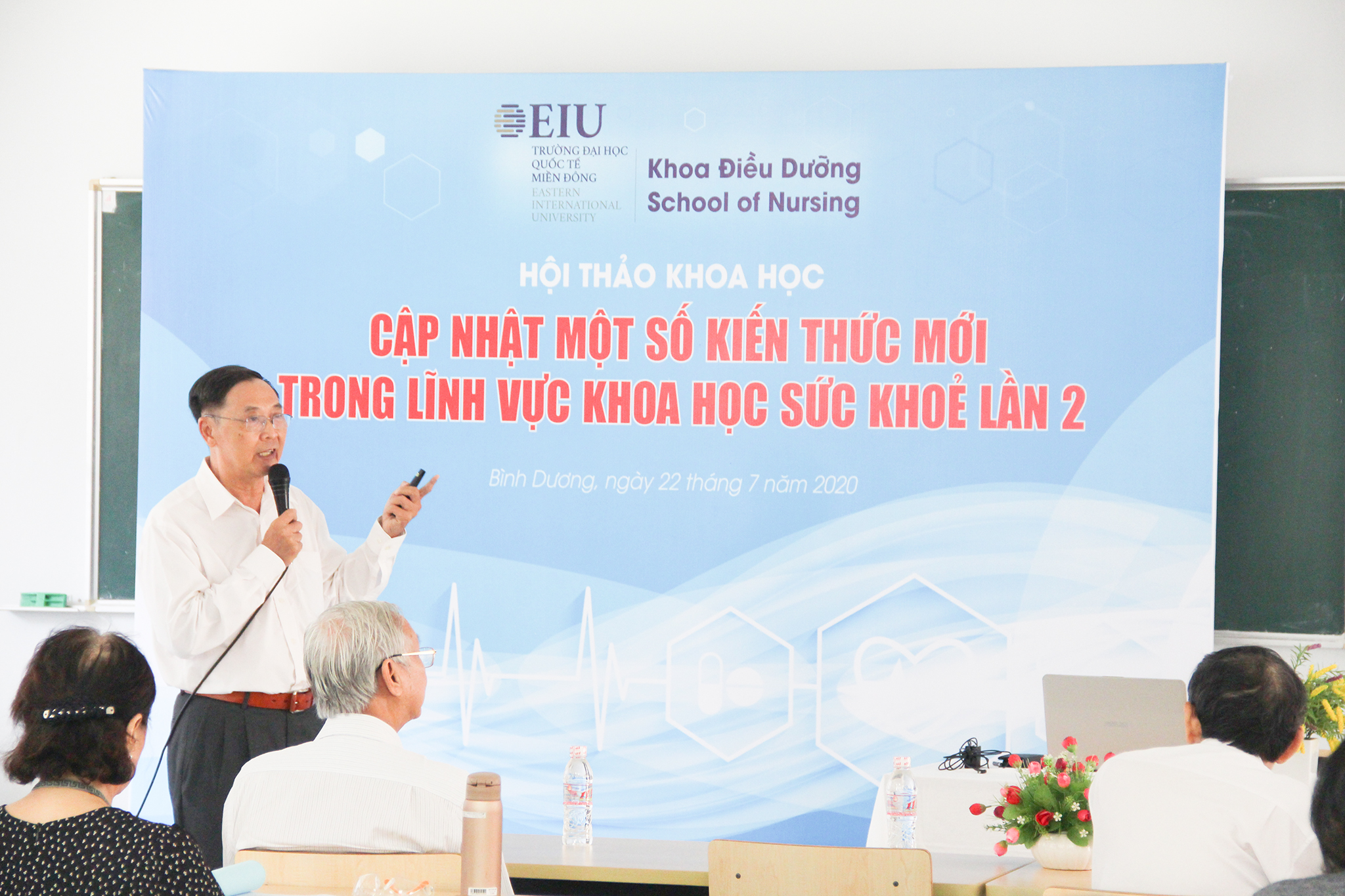 Sau sự hưởng ứng của hội thảo lần I, sáng ngày 22/07/2020 Khoa Điều Dưỡng EIU tiếp tục tổ chức buổi Hội thảo “Cập nhật một số kiến thức mới trong lĩnh vực khoa học sức khỏe lần II” với sự tham gia của các PGS.TS là thành viên ban Đề Án Khoa Y EIU cùng các Giảng Viên , các bạn sinh viên Kkoa Điều Dưỡng và các các bộ chuyên viên EIU. Hội thảo cung cấp nhiều kiến thức mới về các chủ đề như “Tỷ lệ suy yếu ở đái tháo đường tuýp II cao tuổi điều trị ngoại trú” do PGS.TS.Nguyễn Văn Trí trình bày về cách cải thiện, cách chăm sóc các bệnh nhân cao tuổi bị bện đái tháo đường; chủ đề về “Lão hóa da”, các nguyên nhân, tác động gây nên lão hóa da và Metformin trong việc điều trị lão hóa da (trình bày: TS. Trần Ngọc Ánh), “Hiệu quả của phương pháp da kề da với việc bú sữa mẹ của trẻ sịnh mổ tại bệnh viện TP.Hồ Chí Minh” (trình bày : ThS. Phan Thị Thùy Nguyên), “Báo cáo trường hợp lâm sàng nhân một trường hợp tổn thương thận cấp do uống khế chua” (trình bày:BS CKII. Nguyễn Thị Ngọc Linh), “Đánh giá chỉ số BMI của người bệnh ung thư vú đang hóa trị” (trình bày: ThS. Trần Thị Ngọc Toản), “Kiến thức và thái độ phòng ngừa lây nhiễm Viêm Gan B cuả sinh viên Điều Dưỡng trường Đại Học Quốc Tế Miền Đông” (trình bày: CN. Lê Hoàng Phúc)