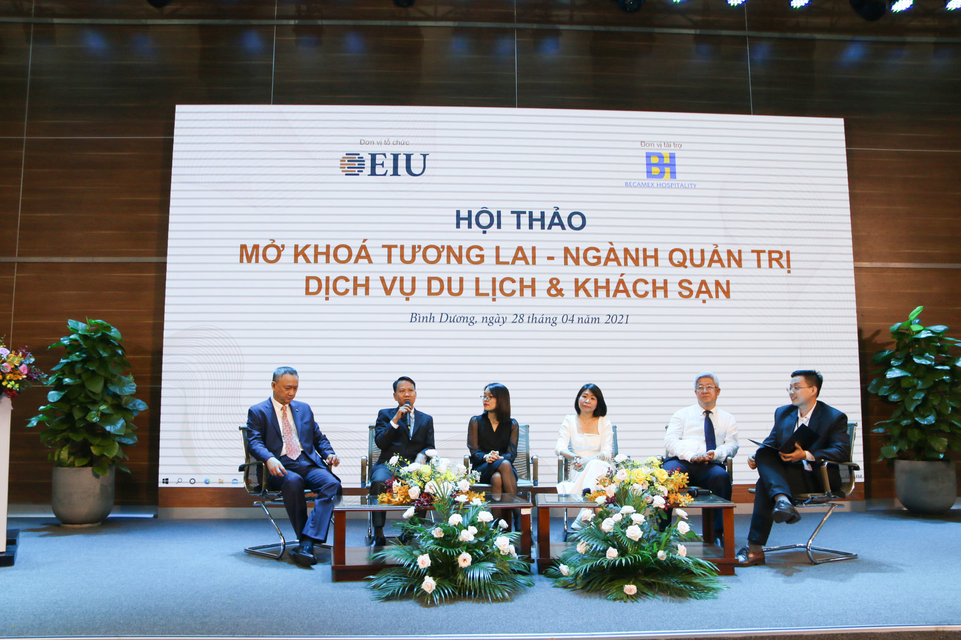 Với mong muốn tạo cơ hội cho các bạn sinh có cái nhìn toàn diện về ngành du lịch và vai trò của ngành Ngành Quản Trị Dịch Vụ Du Lịch & Khách Sạn (QTD-VDL&KS) đối với sự phát triển ngành du lịch nói riêng cũng như nền kinh tế nói chung, đồng thời chia sẻ cùng các bạn những cơ hội nghề nghiệp mà ngành QTD-VDL&KS mở ra trong thời đại mới, EIU phối hợp với Tập đoàn Khách sạn Becamex tổ chức hội thảo với chủ đề “Mở Khóa Tương Lai – Ngành Quản Trị Dịch Vụ Du Lịch & Khách Sạn” với các khách mời đến từ các Tập đoàn Khách sạn và Hiệp Hội Du Lịch tỉnh Bình Dương.
