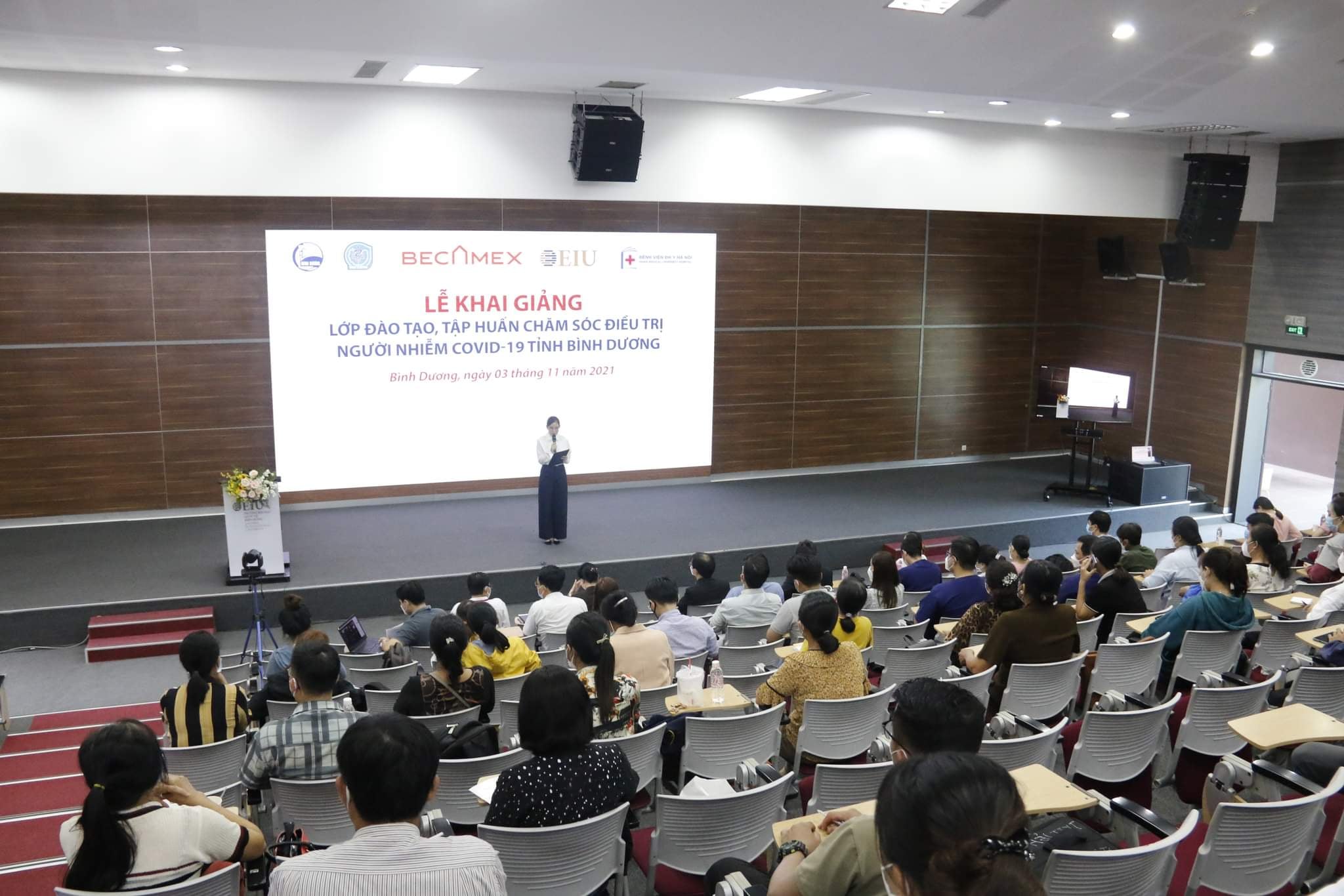 Chiều ngày 3/11/2021 đã diễn ra buổi lễ khai giảng lớp “Tập huấn chăm sóc và điều trị người nhiễm Covid 19” tại hội trường trường EIU, buổi lễ có sự tham gia của PGS.TS. BS Nguyễn Lân Hiếu – Giám Đốc Bệnh viện Đại học Y Hà Nội, Bà Đoàn Thị Hồng Thơm – Phó GĐ Sở Y tế tỉnh Bình Dương, TS. Ngô Minh Đức – Phó Hiệu trưởng EIU, TS. Nguyễn Ngọc Huy – Phó Hiệu trưởng EIU, cùng sự có mặt của các chuyên gia đến từ Đại học Y Hà Nội, các bác sĩ, điều dưỡng đến từ các bệnh viện, các cơ sở khám chữa bệnh, các trung tâm/trạm y tế của tỉnh Bình Dương.