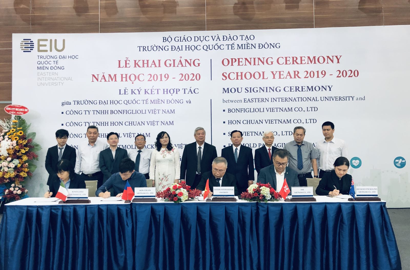 Nhân dịp Lễ Khai giảng, EIU cũng đã tổ chức buổi ký kết hợp tác với các Công ty Bongfiglioli (Ý), Hon Chuan (Đài Loan), SML (Hồng Kong), Detmold Packaging (Úc) là những đối tác quan trọng của Trường trong việc xây dựng chương trình kiến tập thực tập, mang đến nhiều cơ hội việc làm cho sinh viên, cơ hội học bổng, thực hiện đồ án…tạo điều kiện tốt nhất cho sinh viên trong suốt quá trình học tập và sau khi tốt nghiệp. Trong 9 mùa tuyển sinh, EIU cũng đã có 4 khóa sinh viên ra Trường và tỷ lệ sinh viên tốt nghiệp có việc làm chỉ 6 tháng sau khi nhận bằng đạt trên 94%.