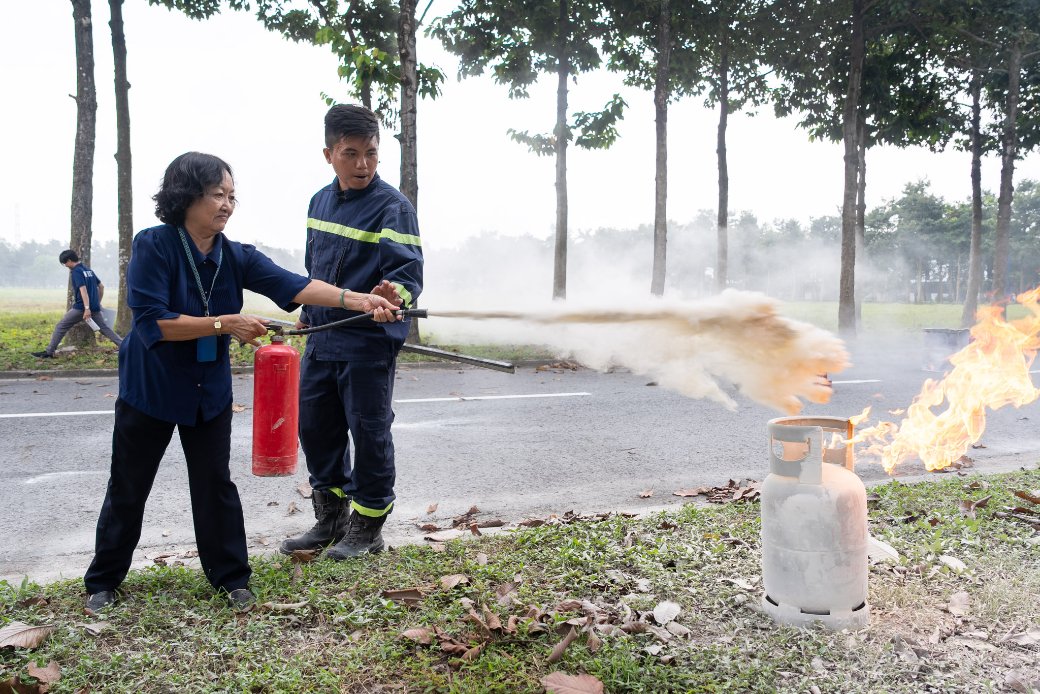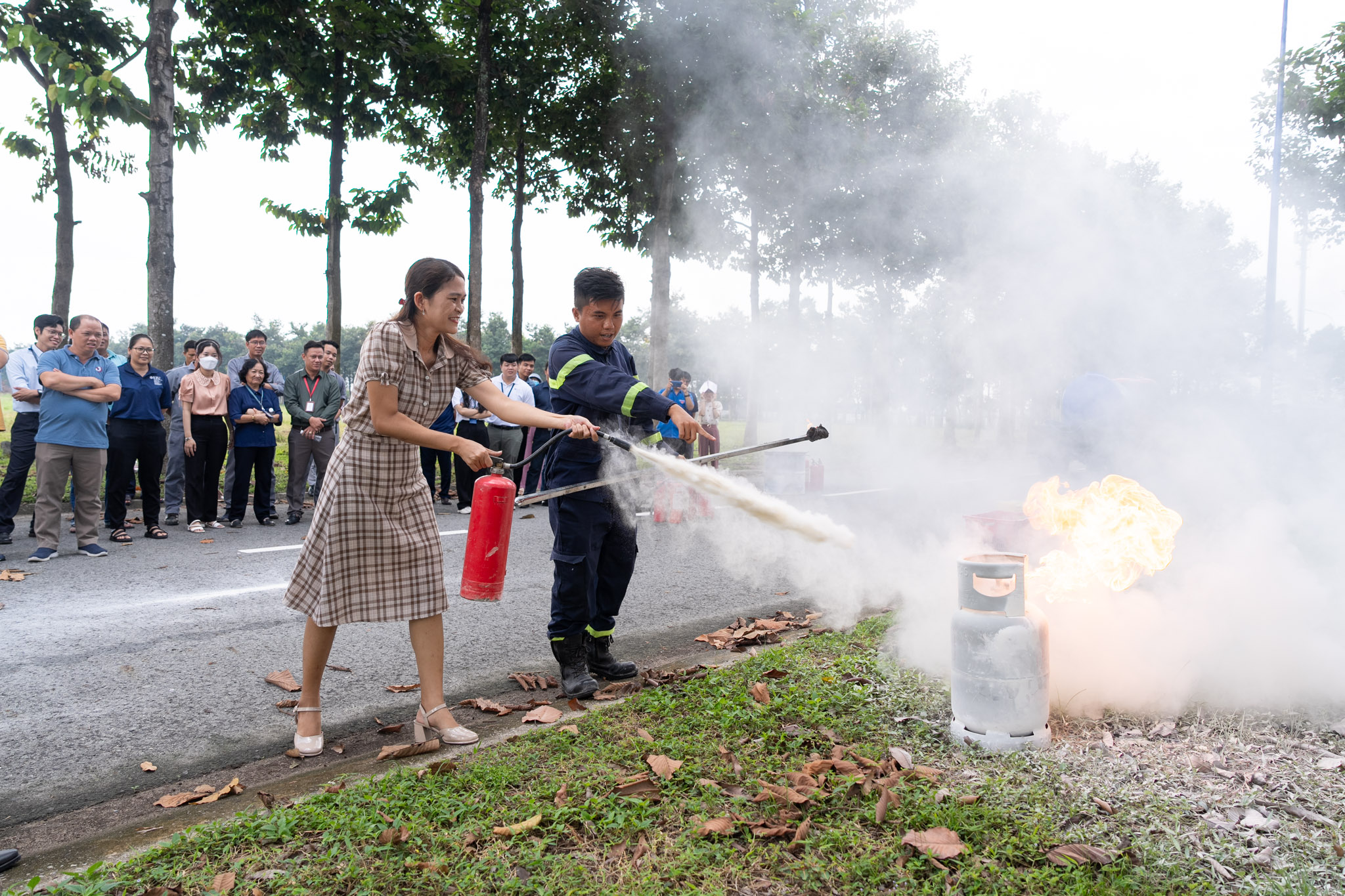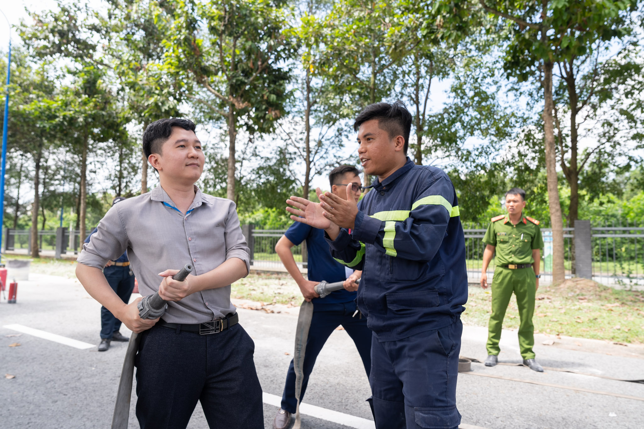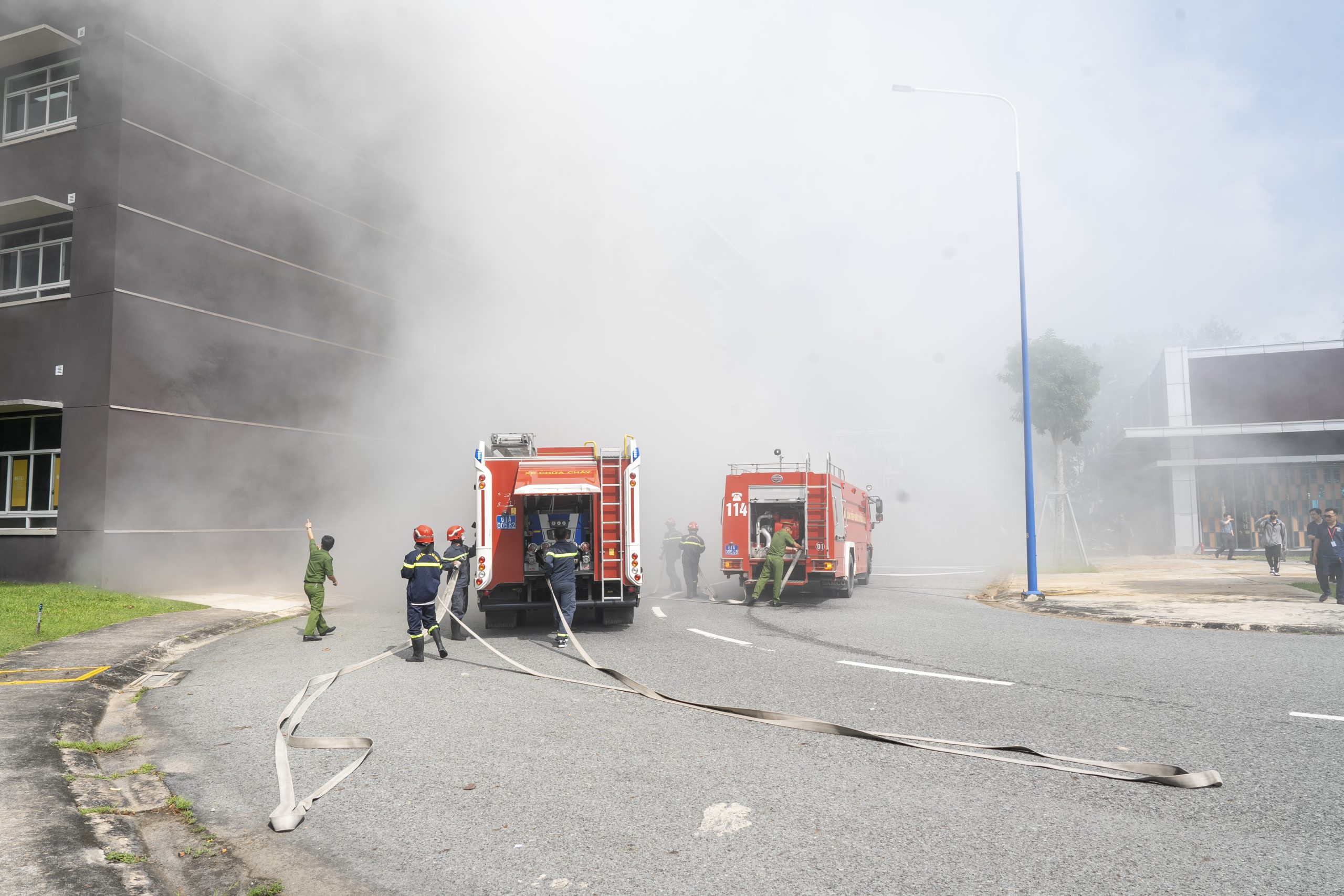 Để buổi diễn tập hiệu quả, Đội Cảnh sát PCCC&CNCH thuộc Công an Tp. Thủ Dầu Một đã điều xe chữa cháy, xe thang, xe cứu nạn cứu hộ, xe bơm chuyên dụng cùng các chiến sĩ cảnh sát phối hợp với lực lượng chữa cháy của EIU triển khai đội hình, nhanh chóng dùng vòi phun nước, giải cứu những người bị kẹt ở đám cháy giả định tại Block 8.