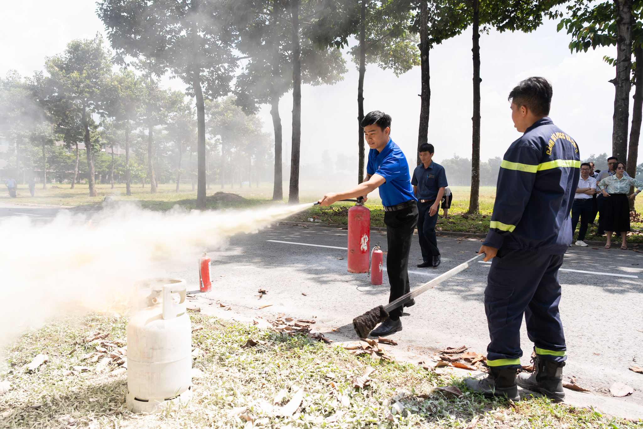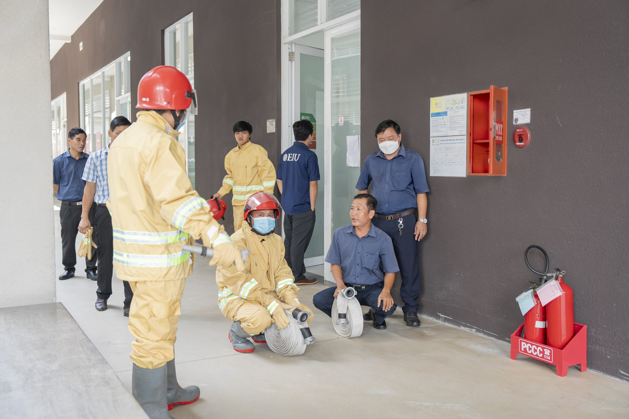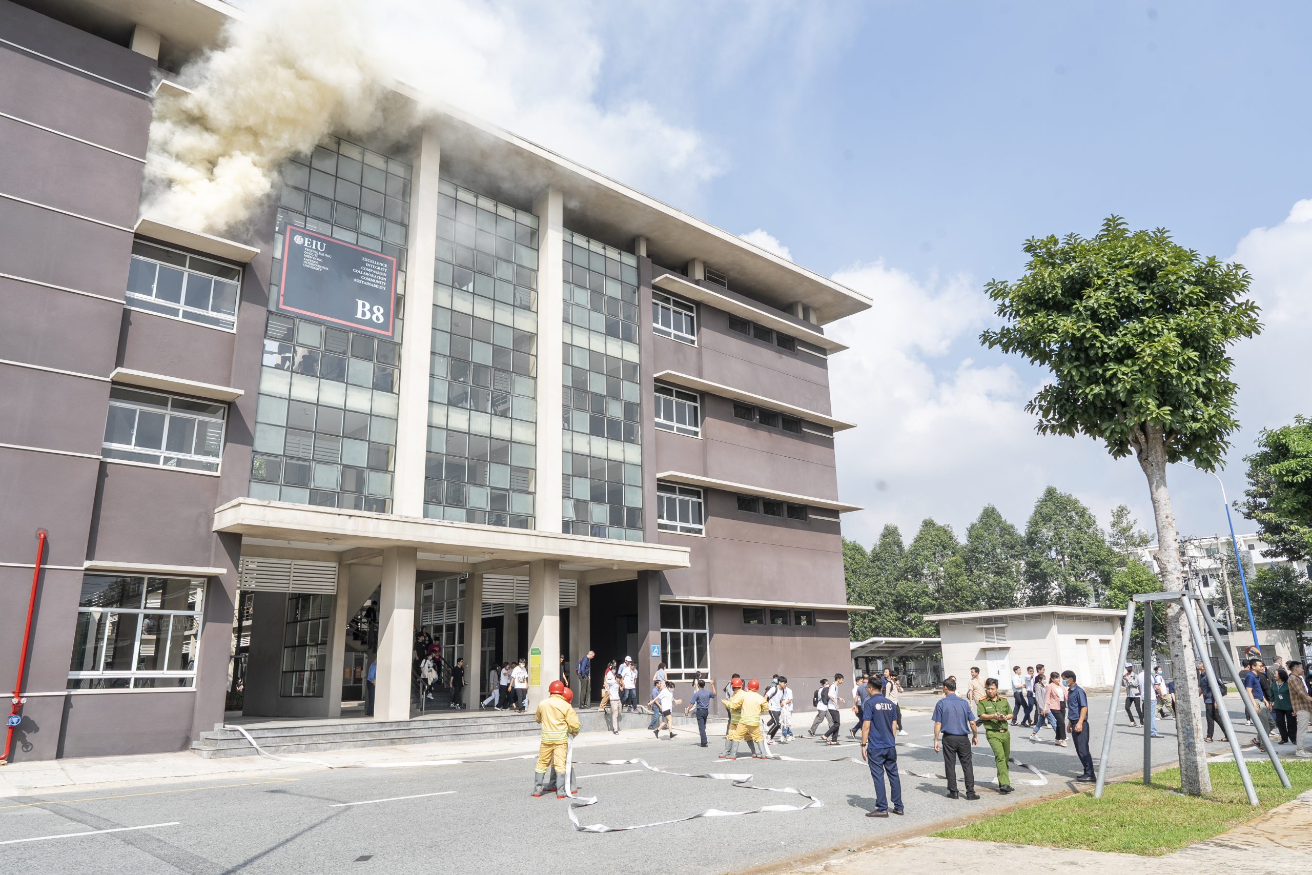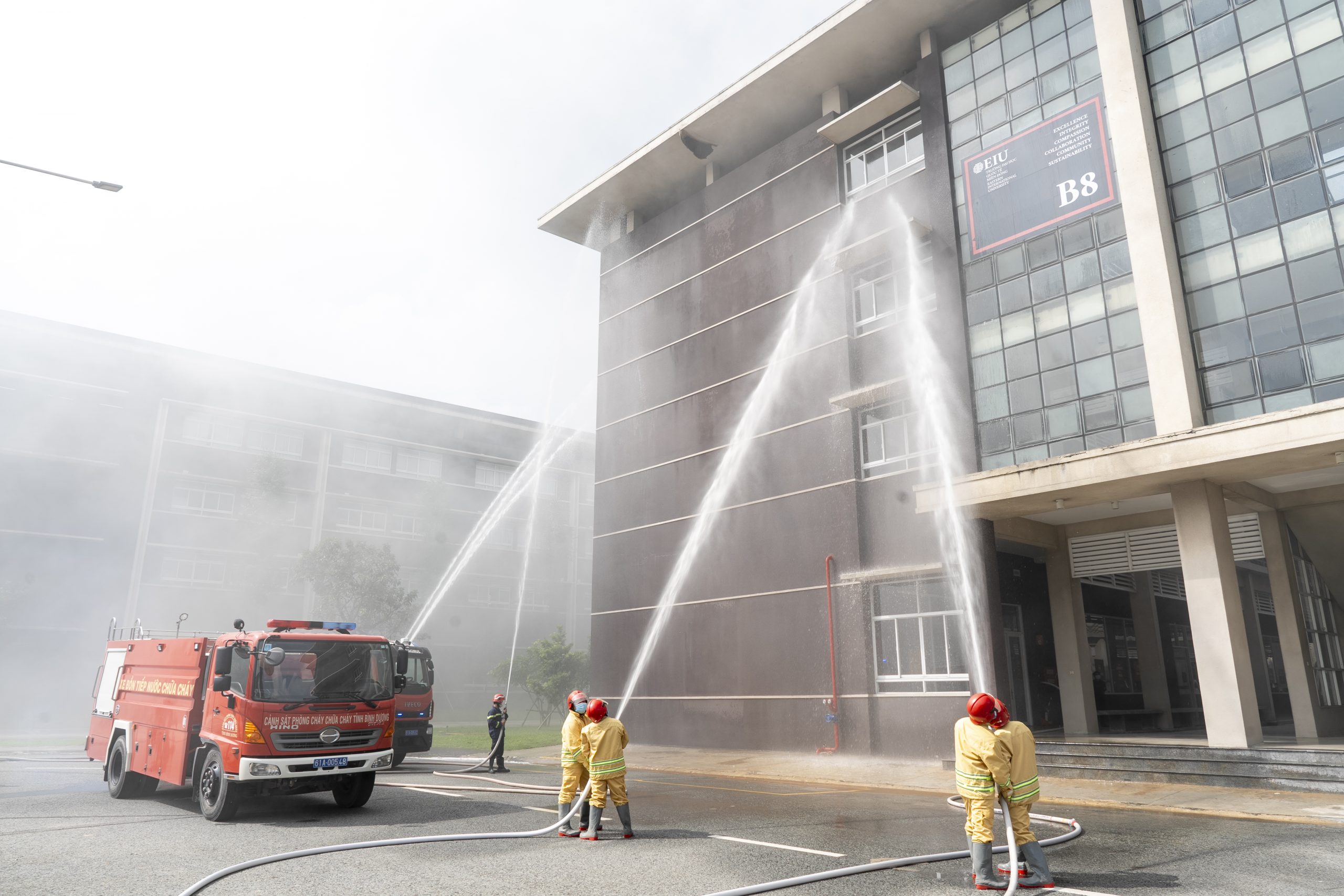 Tại buổi diễn tập khi tình huống cháy giả định xảy ra, lực lượng an ninh tại Block 8 của EIU đã tiến hành báo động, cắt điện khu vực bị cháy, gọi điện cho Đội PCCC&CNCH của Nhà trường, Cảnh sát PCCC 114 và các đơn vị chuyên trách. Song đó, Đội PCCC&CNCH sử dụng các phương tiện chữa cháy tại chỗ như bình CO2, bình bột chữa cháy AB, hệ thống ống nước chữa cháy của tòa nhà để dập lửa đồng thời vận hành hệ thống máy bơm chữa cháy của tòa nhà.