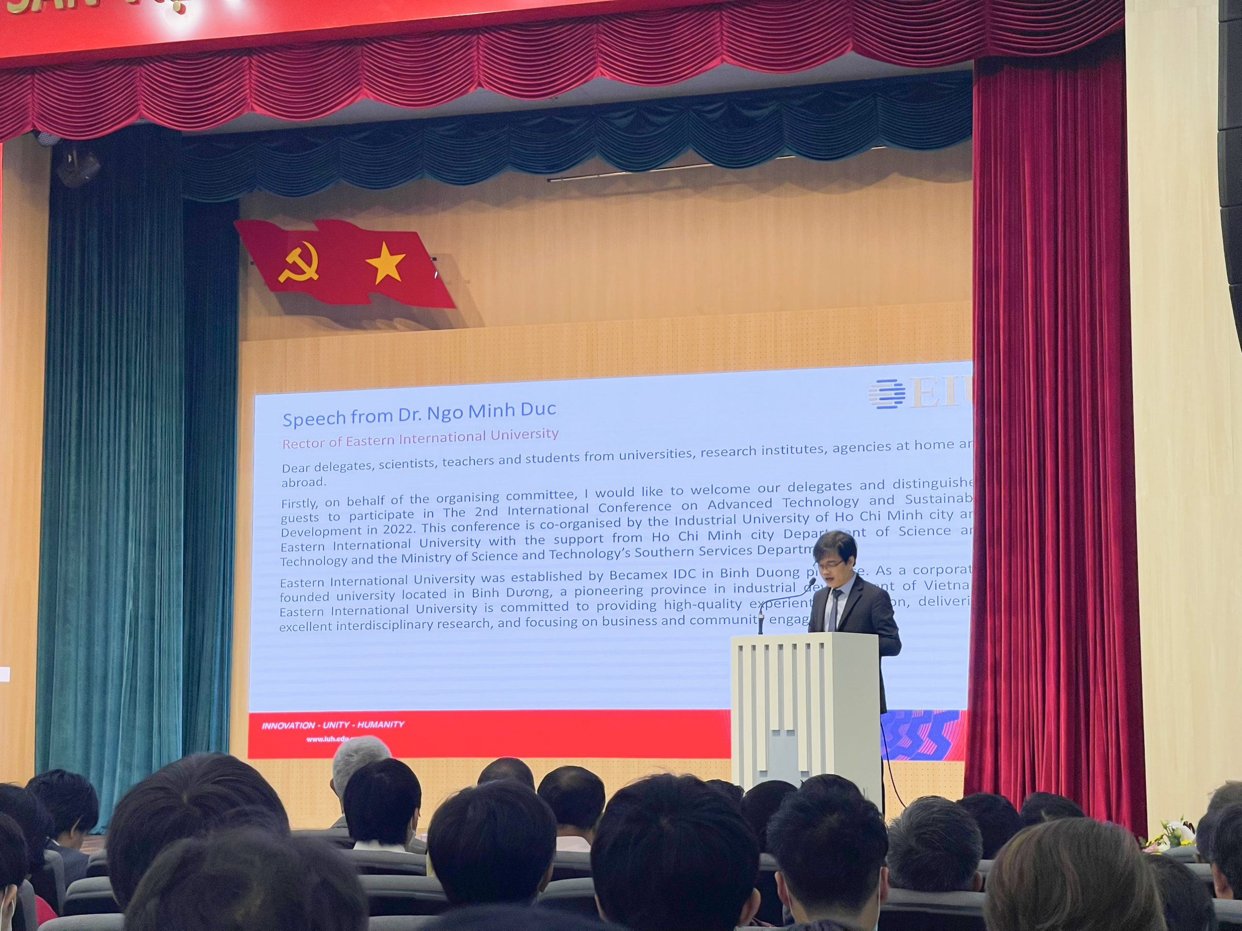 Phát biểu tại hội nghị, TS. Ngô Minh Đức – Hiệu trưởng Trường Đại học Quốc tế Miền Đông chia sẻ: “Đứng trước xu thế về chuyển đổi công nghiệp 4.0, sự bùng nổ về khoa học công nghệ trên toàn cầu, việc phát triển nghiên cứu khoa học, phát triển công nghệ và phát triển hệ sinh thái đổi mới sáng tạo sẽ là chiến lược quan trọng cho sự phát triển bền vững của các cơ sở giáo dục đại học. Trong đó, EIU đặc biệt quan tâm sự hợp tác nghiên cứu liên ngành và các dự án nghiên cứu tập trung giải quyết các vấn đề thực tế của cộng đồng và tại các doanh nghiệp phục vụ đề án Thành phố thông minh, Vùng đổi mới sáng tạo Bình Dương và các vùng lân cận. EIU rất vinh dự cùng IUH và các đơn vị đồng hành tổ chức Hội nghị quốc tế về Công nghệ tiên tiến và Phát triển bền vững – Lần thứ 2 Năm 2022. Đây không chỉ là dịp để các nhà khoa học, các chuyên gia, các giảng viên, sinh viên gặp gỡ và chia sẻ nhiều thành quả nghiên cứu KHCN mà còn là cơ hội để hai Trường mở rộng mạng lưới kết nối với cộng đồng khoa học trong và ngoài nước tạo tiền đề cho nhiều hợp tác để từng bước phát triển đội ngũ nhân sự NCKH, tăng cường chất lượng NCKH.”