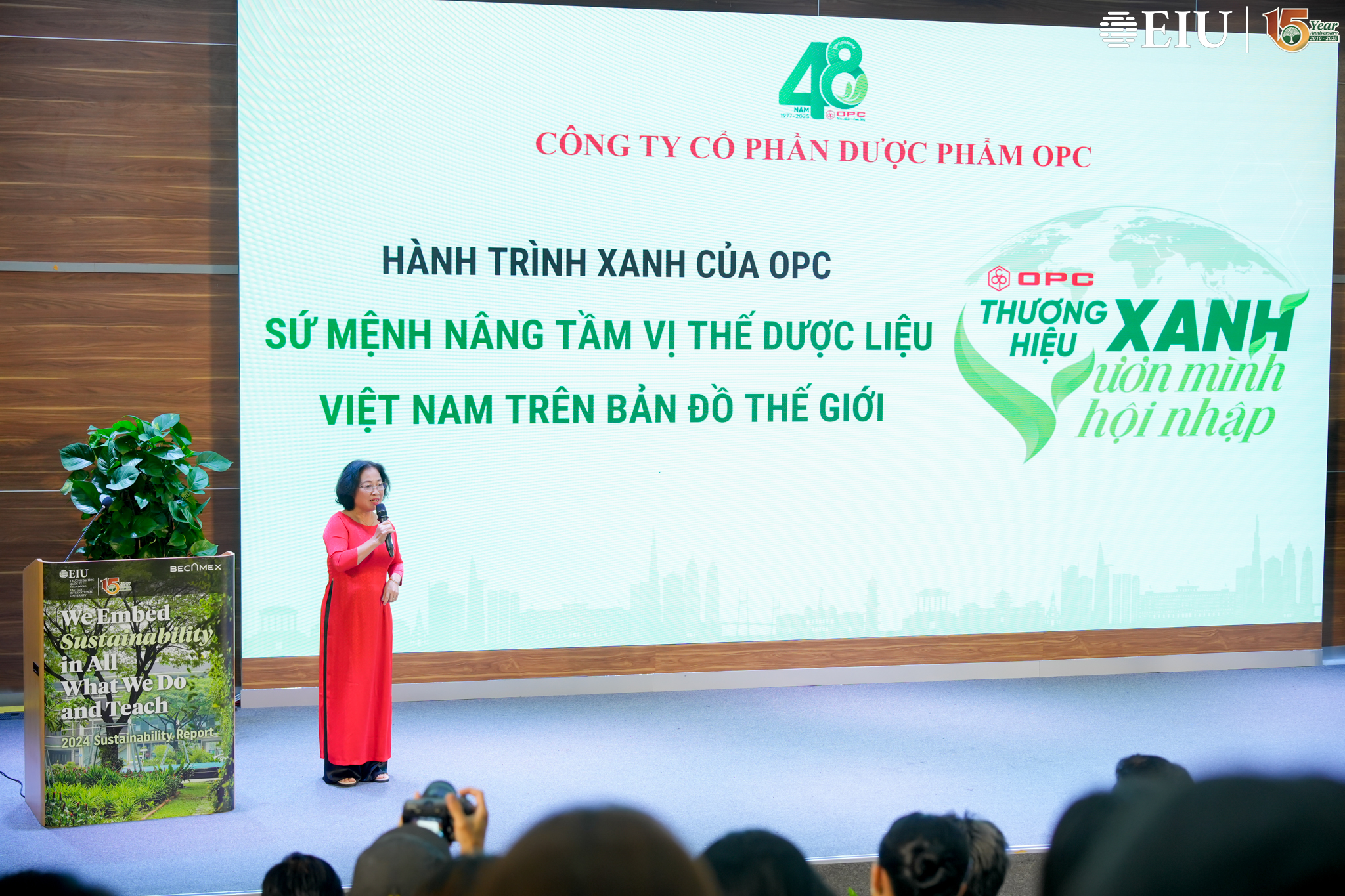 Trong khuôn khổ của chương trình UniTour tại EIU, thông điệp ấy được lan tỏa mạnh mẽ qua phần chia sẻ của các doanh nghiệp như Công ty Cổ phần Dược phẩm OPC và Vina T&T Group trong tọa đàm “Doanh nghiệp đồng hành – sinh viên sáng tạo – R&D bền vững”. Các lãnh đạo doanh nghiệp nhấn mạnh vai trò sống còn của nghiên cứu và phát triển (R&D) trong việc xây dựng mô hình kinh doanh xanh, bền vững. Đây cũng chính là mảnh ghép trùng khớp với định hướng đào tạo và nghiên cứu của EIU – khuyến khích sinh viên sáng tạo, dấn thân và tìm ra giải pháp mới cho những thách thức của xã hội.